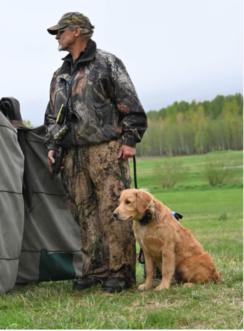 Action is a powerful, athletic well balanced boy with good bone and a striking male head but still retaining a lovely Golden expression. He has a strong topline, proper front, and tail set, with a nice straight quick dry coat. He weighs in at 73 lbs but is very agile in the field, he can really cover the ground. Action [Mr. Automatic] is a biddable boy and picked up on things easily and went out and did it. He is a strong remarkable athlete and an excellent marker. He ran the CKC National Field Trial Championship 2023 at 12 years of age and made it to the 8th series. Action is a proven goose and duck hunter with an incredible tenacity on wounded bird. He is quiet and obedient in the blind and easy to handle on the line.